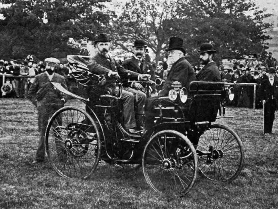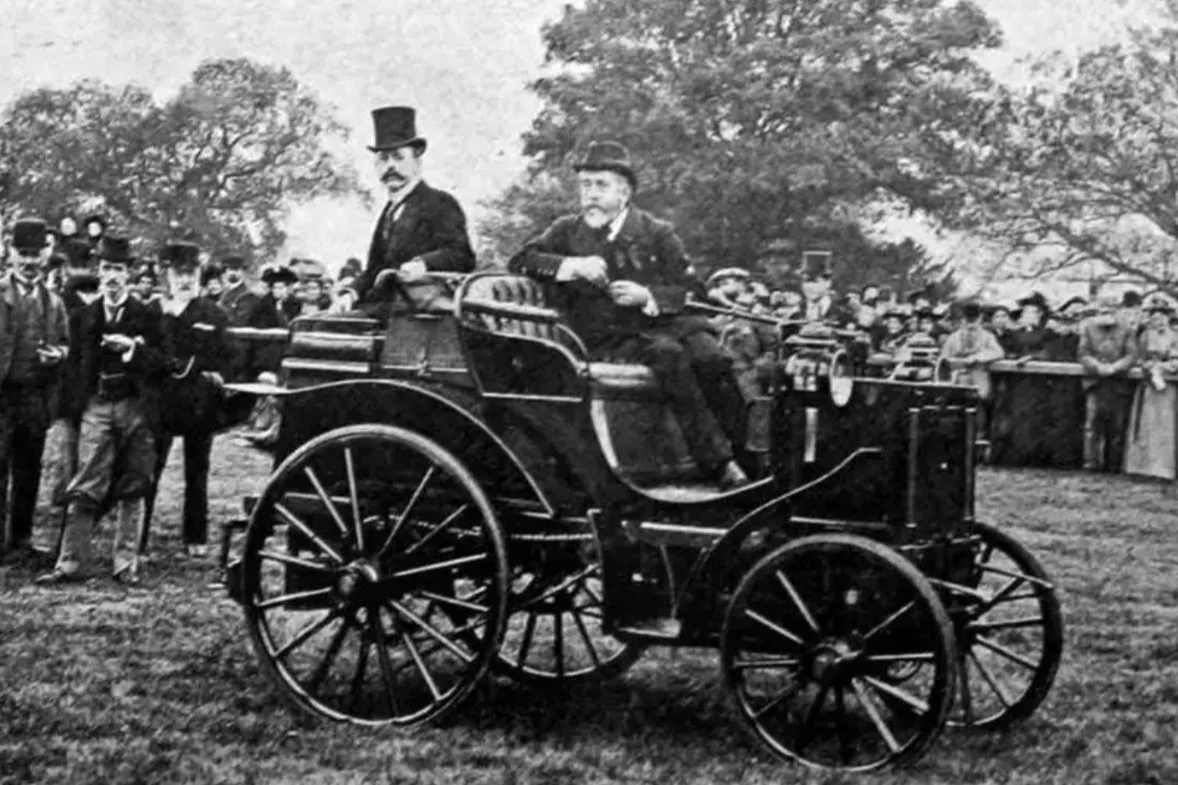 Horseless Carriage Exhibition - Sir David Lionel Salomons, a pioneering motoring enthusiast sits proudly aboard his two-cylinder, 3.5hp Daimler-engined Peugeot at the event on his grounds. Salamons was a highly respected scientist whose passion and research on electrical science led him to chair the company that electrified most of London.