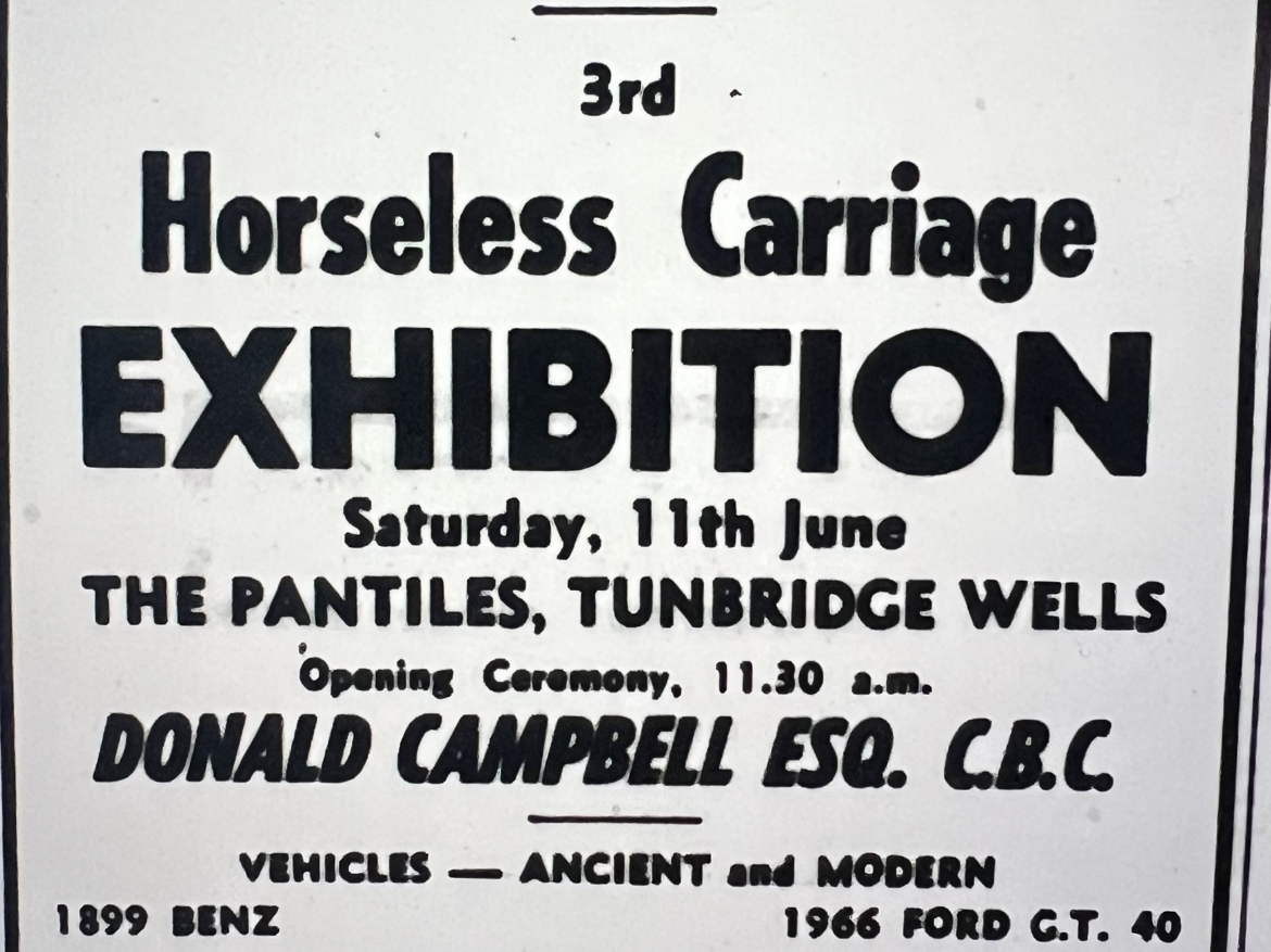 June - following the second horseless carriage exhibition held in 1961 on the Pantiles, the Tunbridge Wells Motor Club followed suit with the third event on June 11th 1966, hosted by eight time world speed record breaker Donald Campbell with over 12,000 people in attendance!